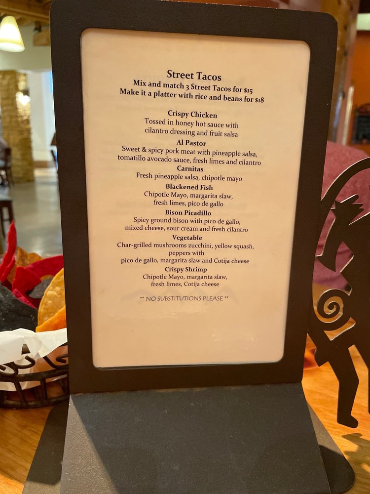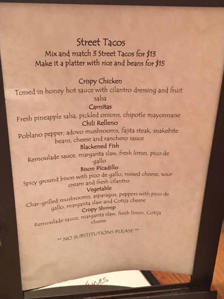 Tilapia in crisp corn shells, margarita slaw, chipotle aioli, pico de gallo, southwest rice & black beans.